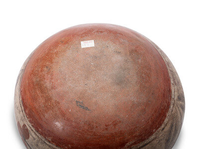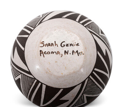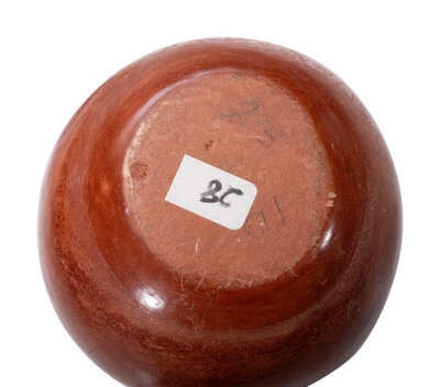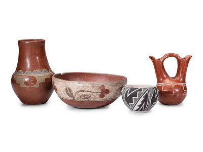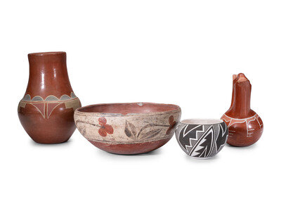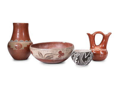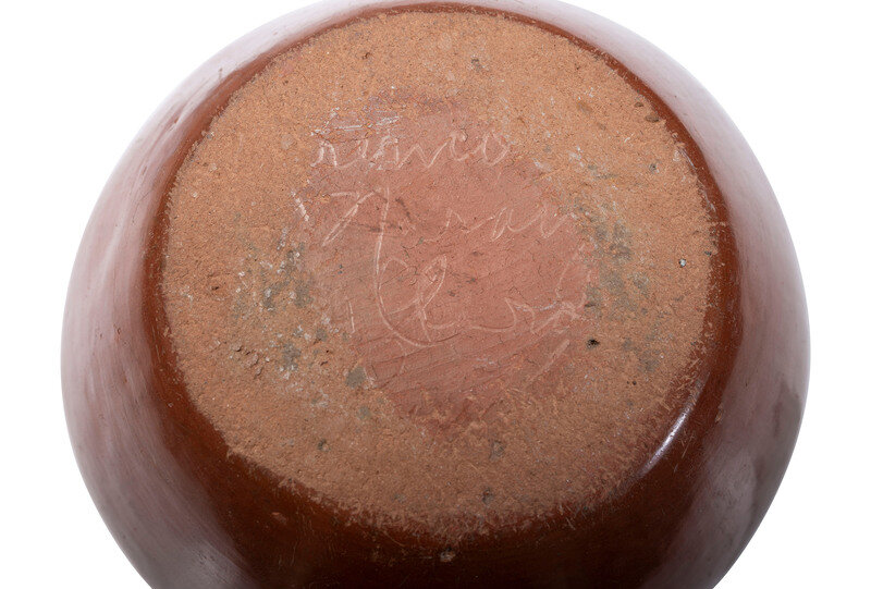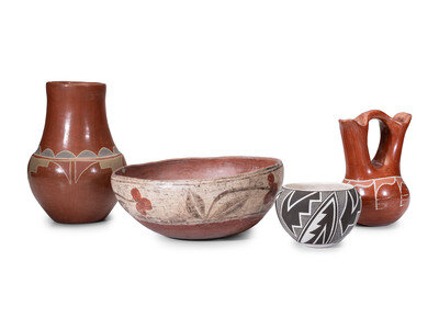 a Santa Clara redware vase with blue, yellow, and red painted designs