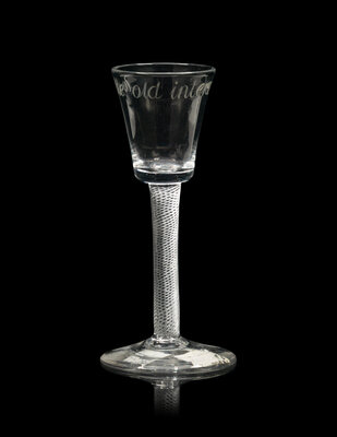 the bucket form bowl engraved 'to the old interest' below rim and raised on an airtwist stem.