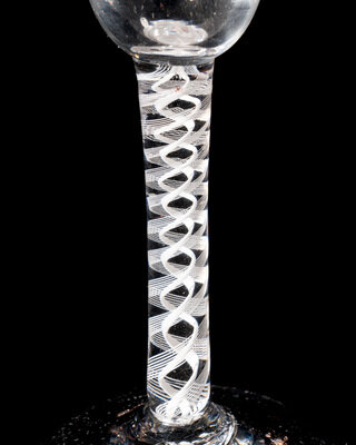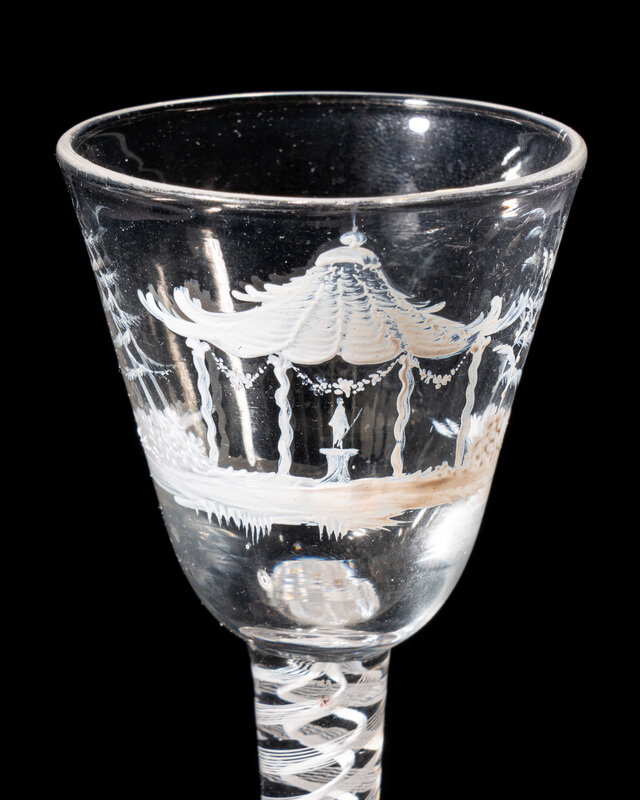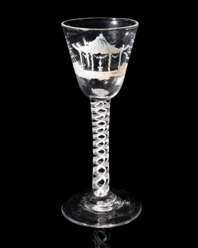 the rounded funnel bowl decorated with a Chinoiserie influenced pagoda and garden and surmounting a stem with a twin-ribbon core encircled by a twin eight-ply spiral bands.