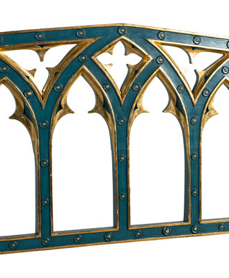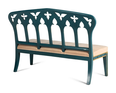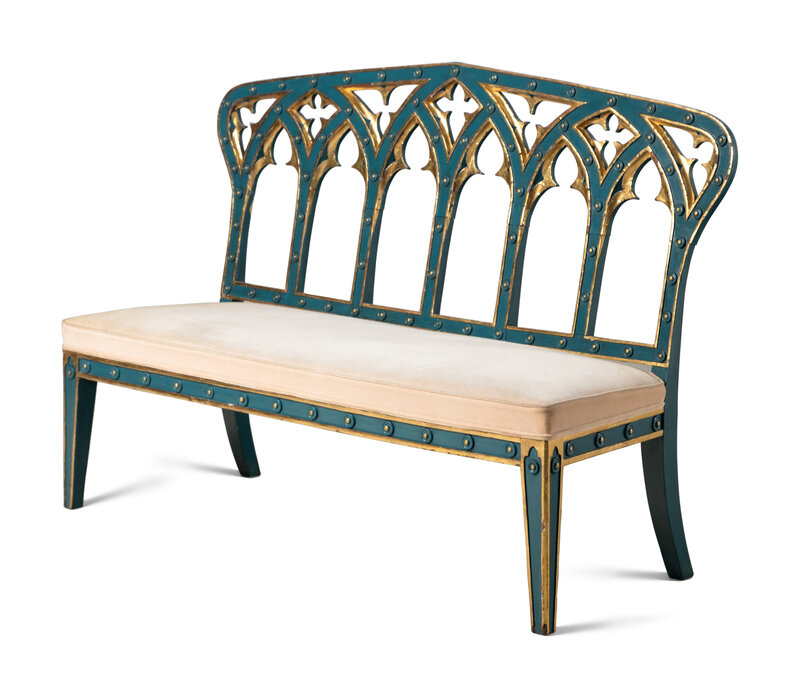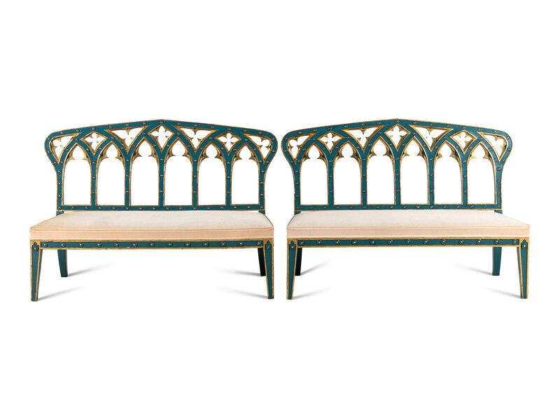 A Pair of English Gothic Revival Painted and Parcel Gilt Settees
