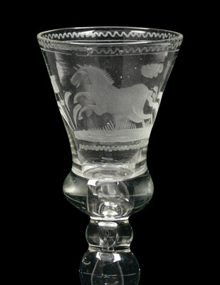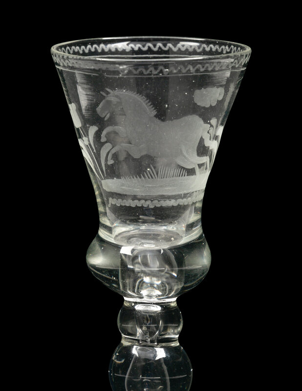 the thistle bowl decorated with an engraved 'White Horse of Westphalia' motif and raised on a baluster stem encasing a tear drop.