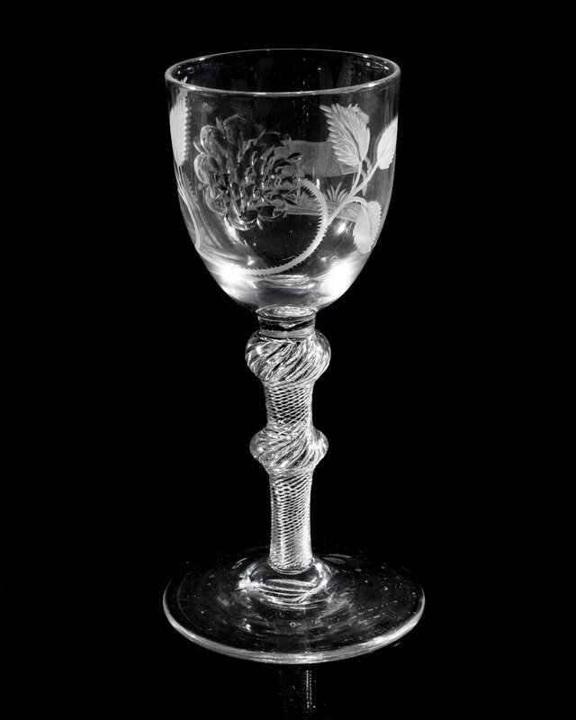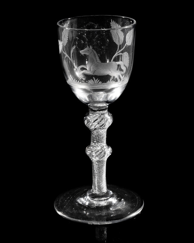 one side of the round funnel bowl engraved with a rose of Hanover, the opposite side of body engraved with a horse and surmounting an air twist stem with knops at shoulder and center of stem.