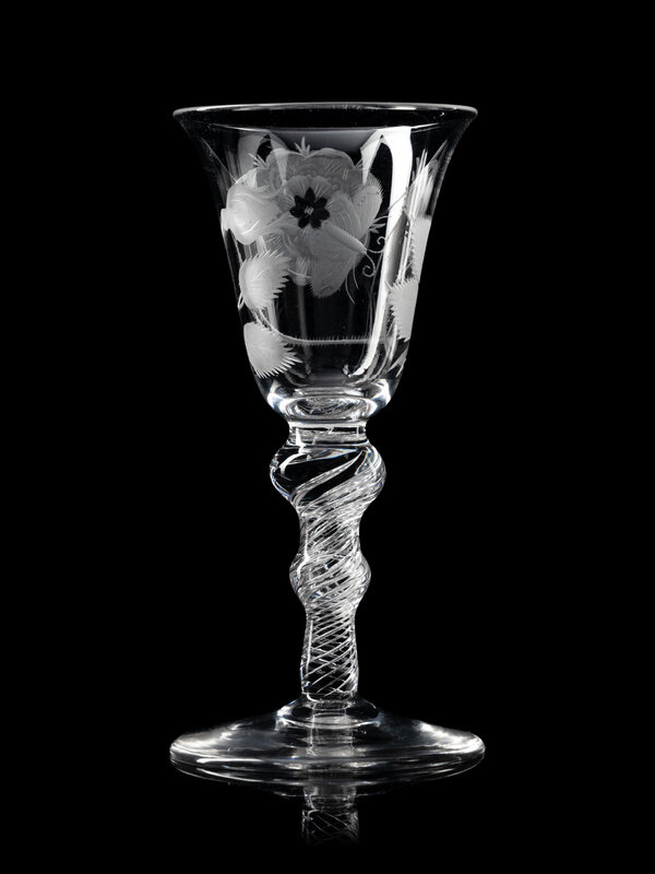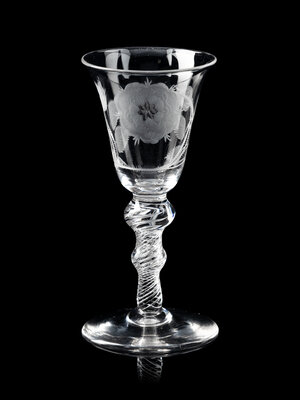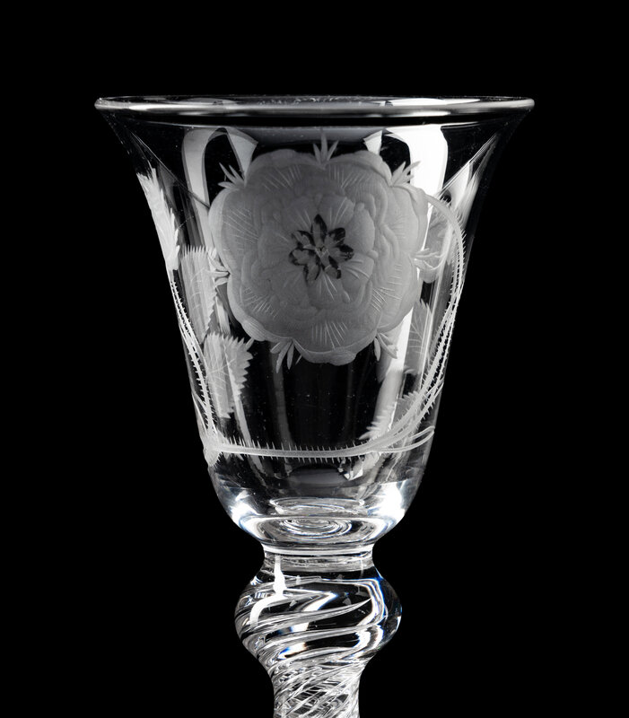 the bell-form bowl engraved with Jacobite roses and a moth and surmounting an air twist stem with knops at top and middle of stem.