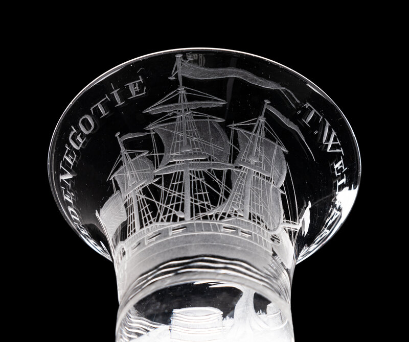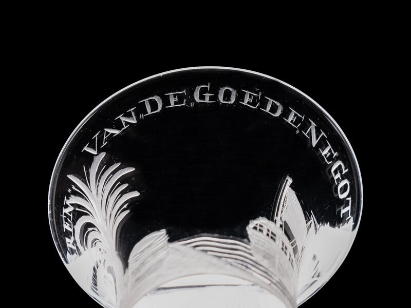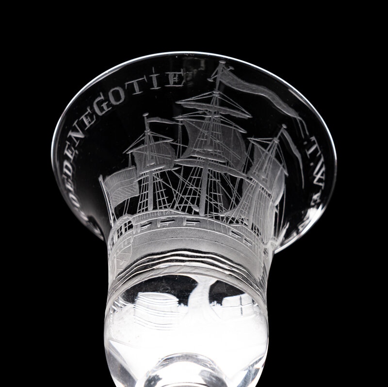 the bell shaped bowl engraved with the inscription 'T Wel Vaaren Van de Goede Negotie' above a three masted ship and an island motif and raised on a stem with an tear decorated knop and a flattened knop base.