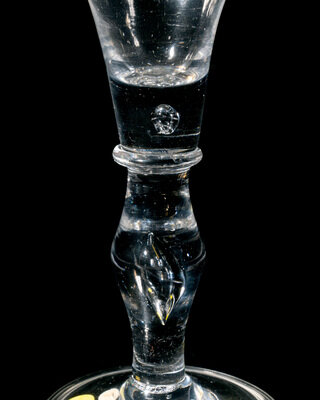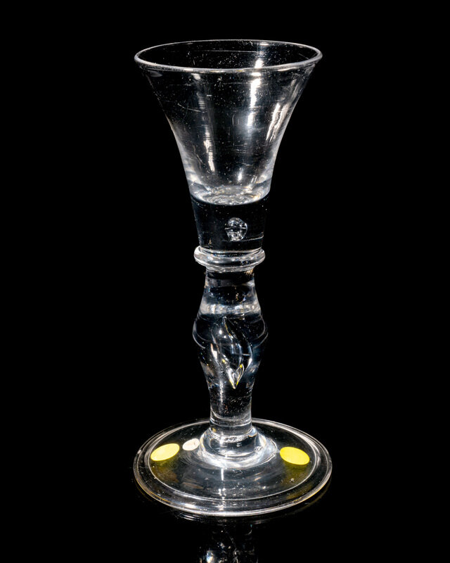 having a trumpet bowl with a tear in the bowl base and resting on a collar over a plan stem with a swelling knop and tear.