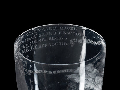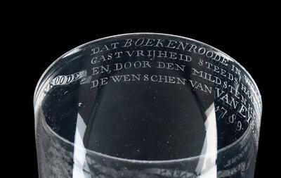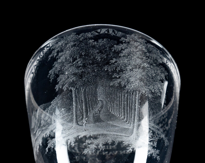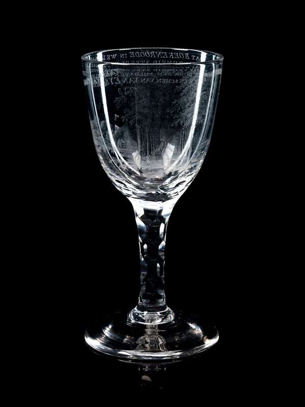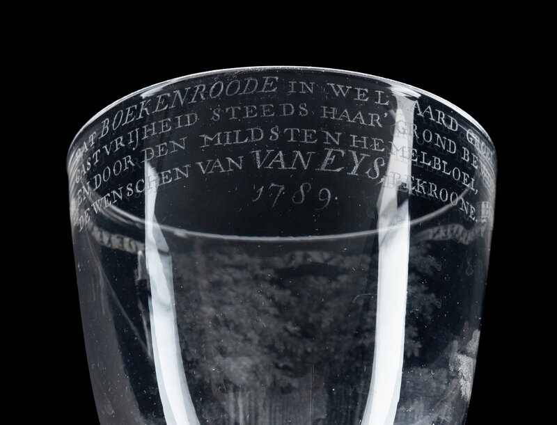 the funnel bowl with a stipple-engraved forest and village scene, the opposite side with engraved inscription 'Dat Boekenroode in wel vaard groei gastvrijheid steeds haar grond bewoone en door den Mildsten hemebloei, de wenschen van Van Eys, Bekroone-1789' and raised on a facet cut stem.