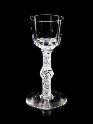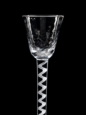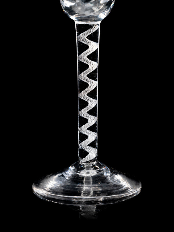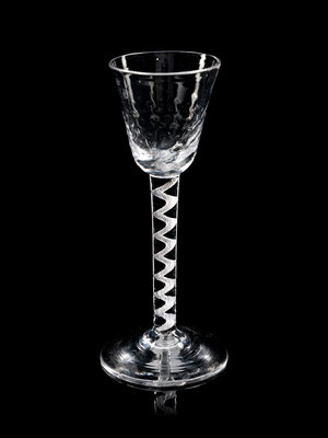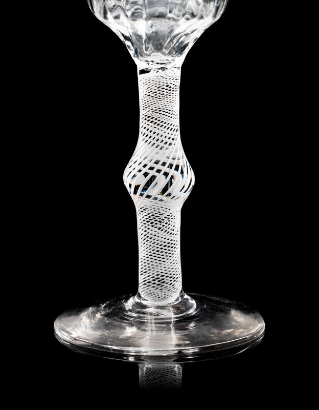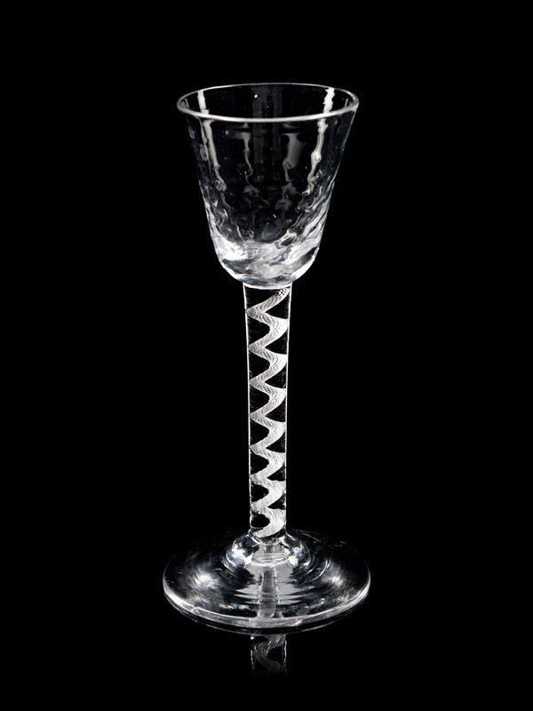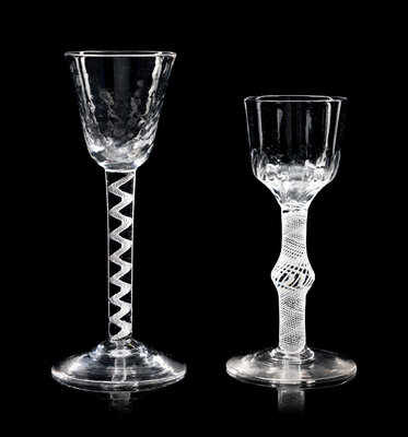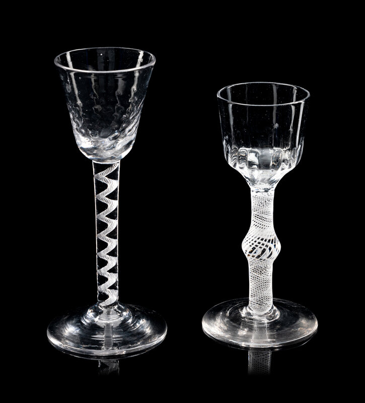 comprising an opaque twist wine stem with an ogee bowl with fluting at base of bowl and raised on an opaque twist stem with a central knop, the other example with a rounded funnel bowl with hammered moulding decoration to bowl and air twist stem and raised on a conical foot.