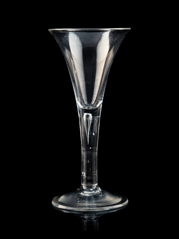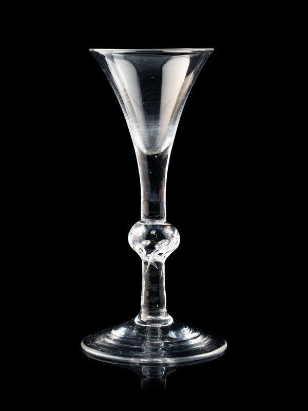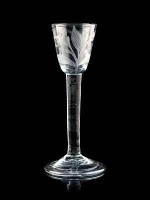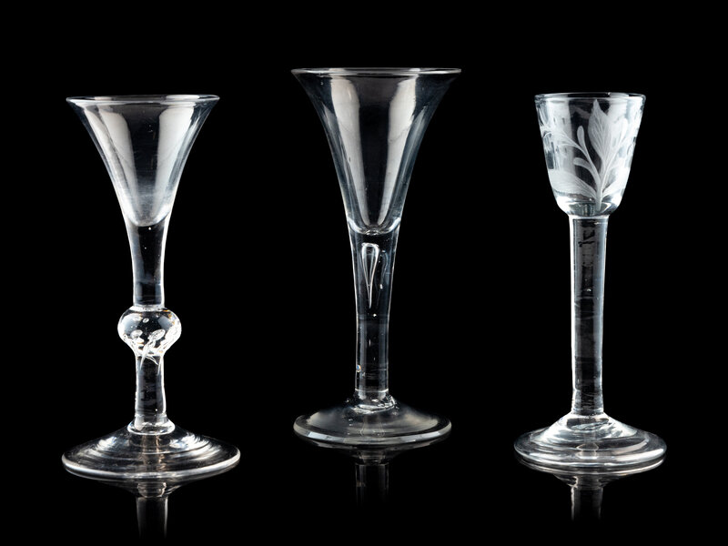 comprising an example with a rounded funnel bowl engraved with a Lily of the Valley and raised on a plain elongated stem ending in a folded foot, the second example with a flared-conical bowl and raised on an elongated stem encasing a single teardrop ending in a conical foot, the third example with a flared-conical bowl and raised on a plain stem with a central tear decorated knop and ending in a domed foot.