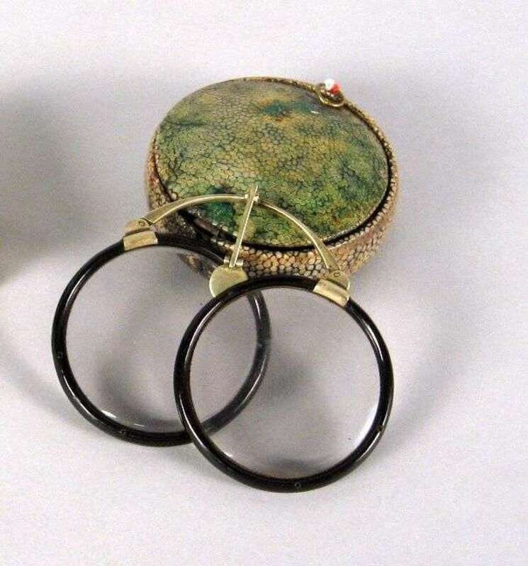 The circular lenses in hardwood frames with an arched white metal bridge, in a hinged circular green stained shagreen case.