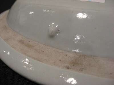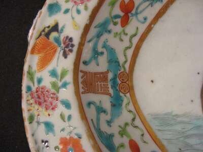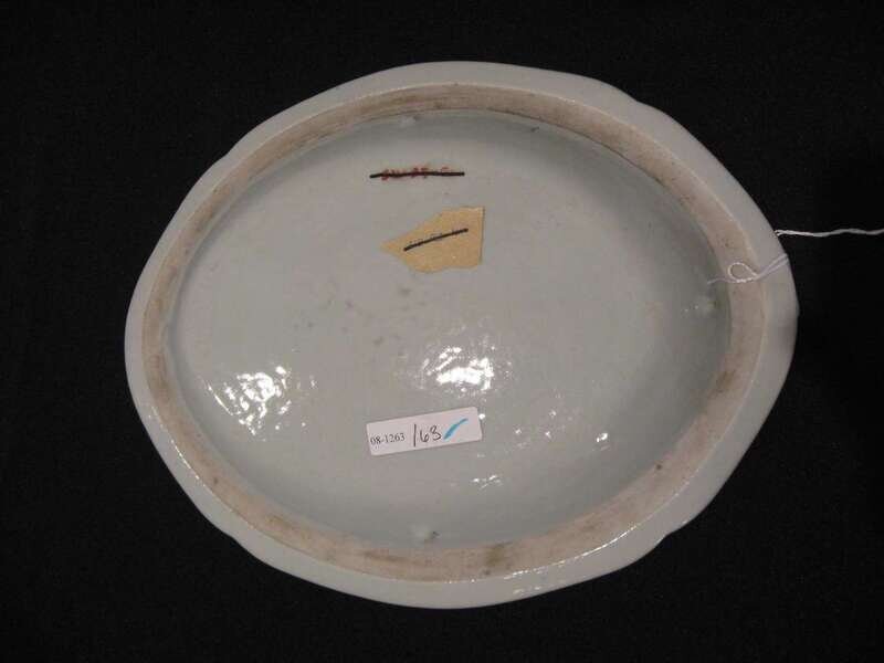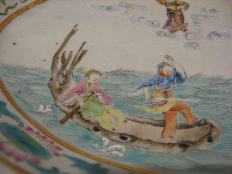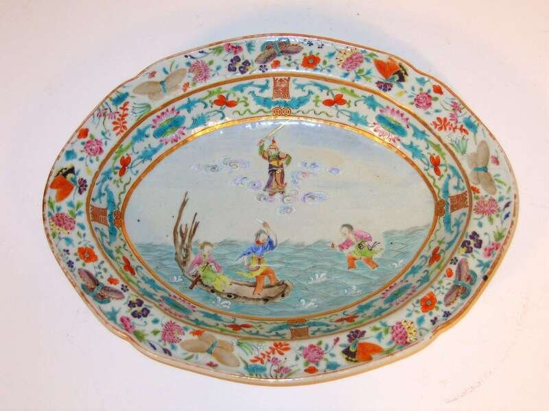 Of oval form, the central medallion of Sampan and God of the Sea, framed by a border of butterflies, shou symbols and floral sprigs.