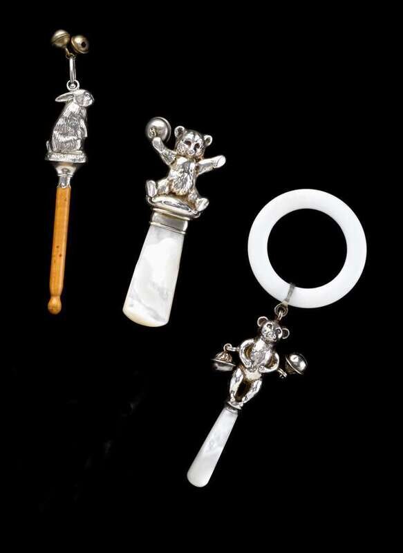 Comprising a Birmingham mother of pearl handled example by Crisford & Norris modeled as a standing bear, a mother of pearl handle rattle by the Webster Company modeled as a seated teddy bear, and an English silver rattle with marks rubbed, modeled as a seated rabbit. (3).