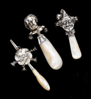 Comprising an unmarked rattle modeled as a baby's head, a modeled clown rattle stamped 'Sterling' and an unmarked whistle/ rattle modeled as buttons tied together. (3).