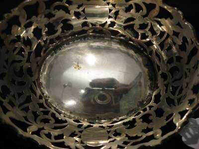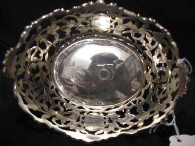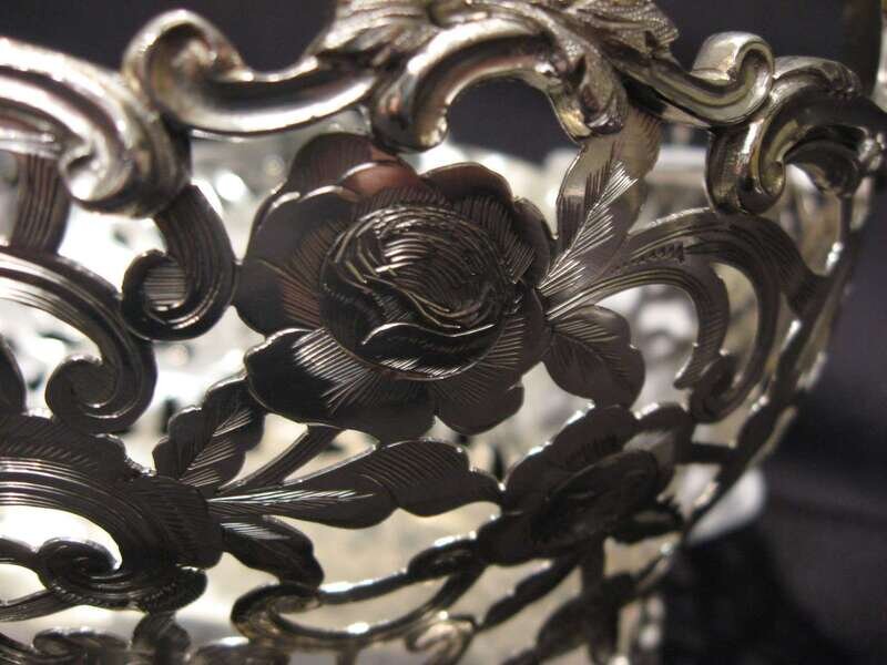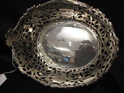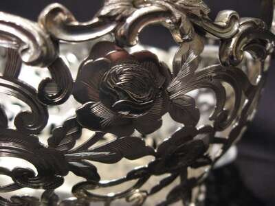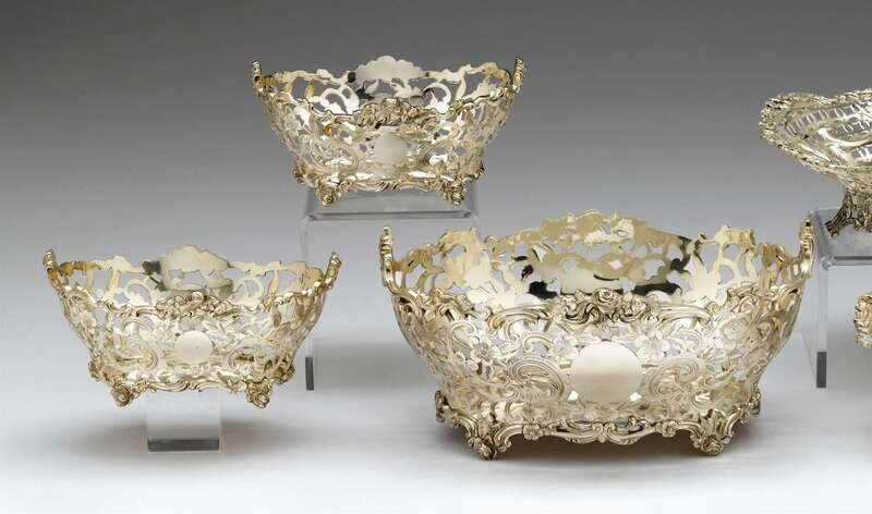 Comprising two footed baskets together with a matching center basket, all with pierced foliate and c-scroll decoration raised on rose bloom feet. (3).