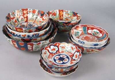 Eight Japanese Imari bowls and four trays mostly late 19th century