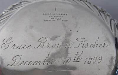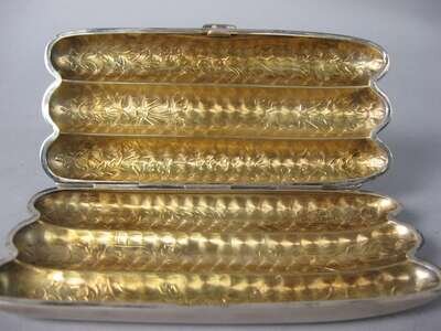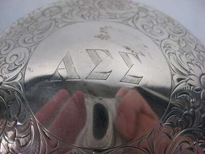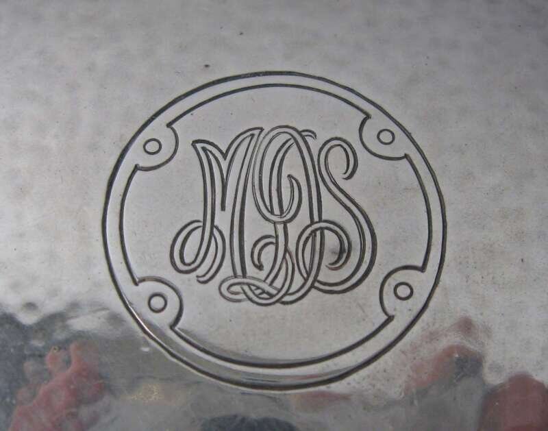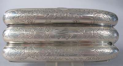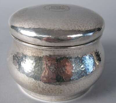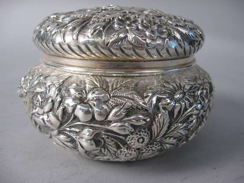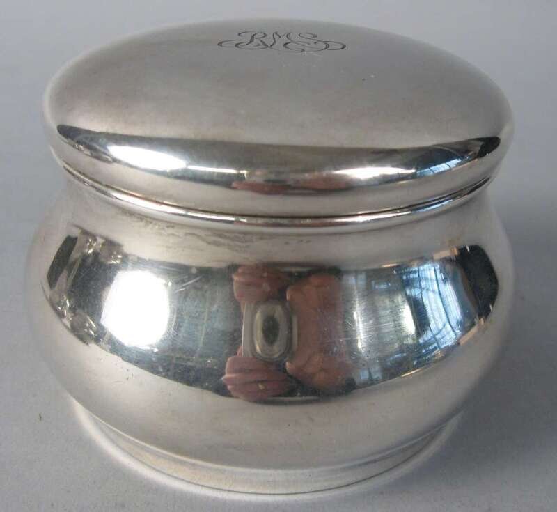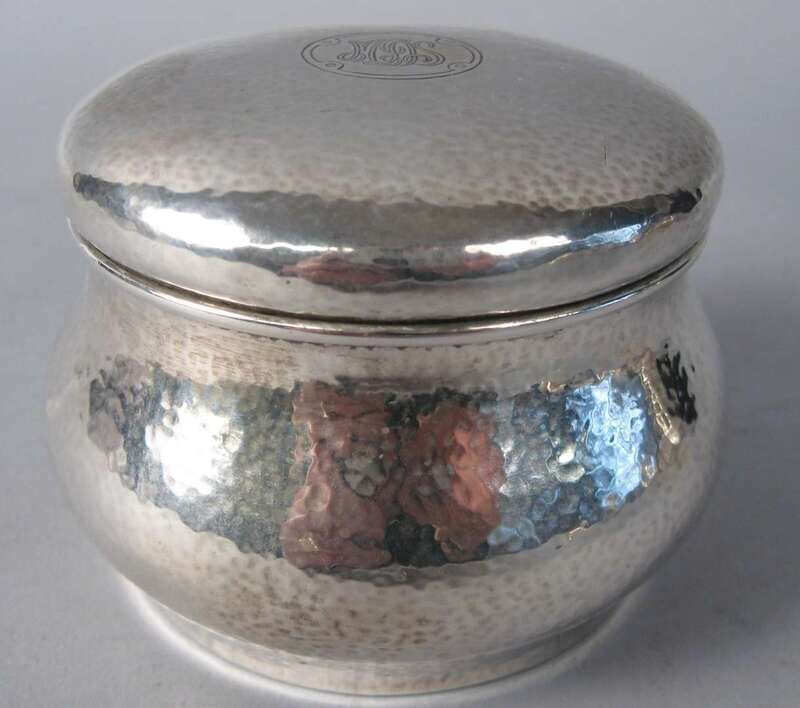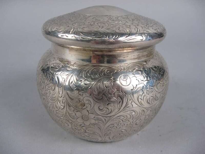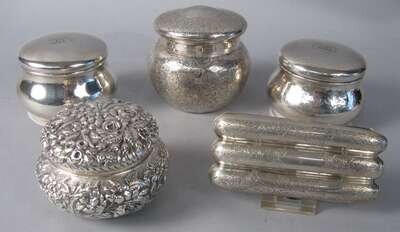 Comprising a Tiffany & Co. hammered silver example with date marks for 1907-1947, a plain Tiffany & Co. powder jar with date marks for 1907-1947, a Sweetser & Co. box with over all etched decoration of flowerheads and c-scrolls, retailed by Bailey, Banks & Biddle and a Jacobi & Jenkins box with allover repousse decoration of foliage; together with a sterling silver cigar case with etched decoration of ribbon tied garlands. (5).