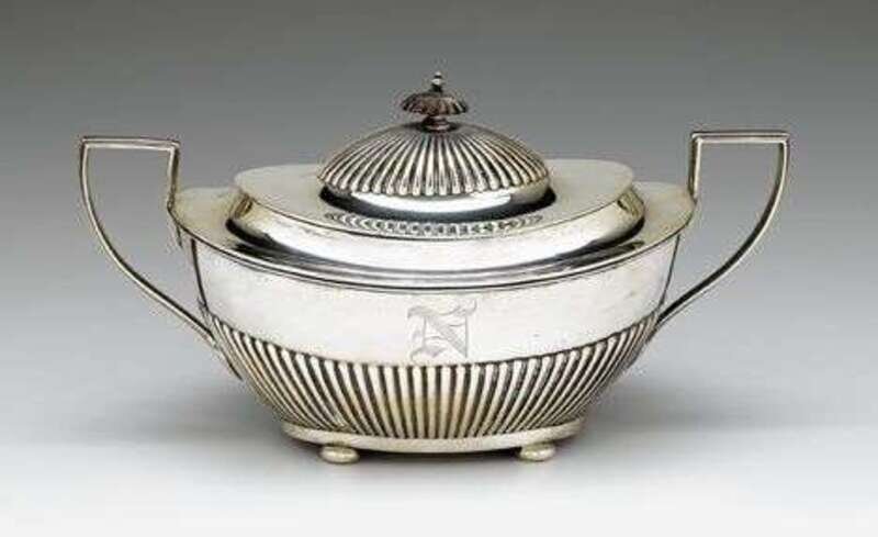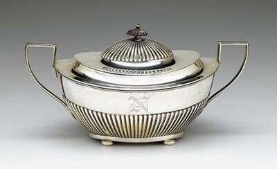 Oval form with angled handles and part-reeded sides, raised on squat bun feet, monogrammed 'N', the cover with a treen finial.