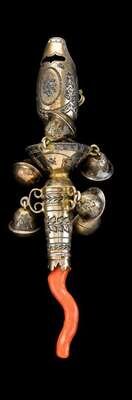 George III sterling silver gilt bright cut and coral mounted baby rattle possibly james hyde, london, 1796