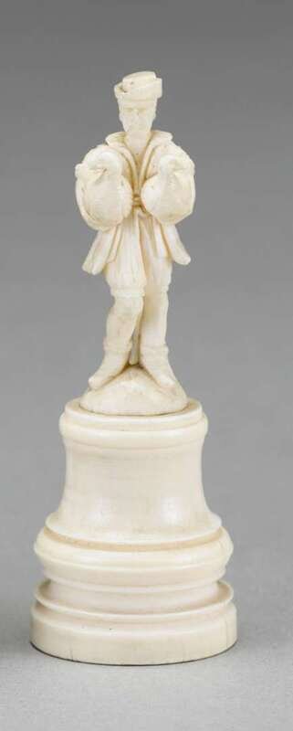 Depicting a man with a goose under each arm, on an ivory pedestal base.