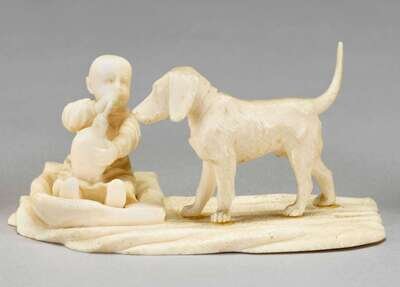 Carved depicting a child seated on a cushion drinking while a dog looks on.