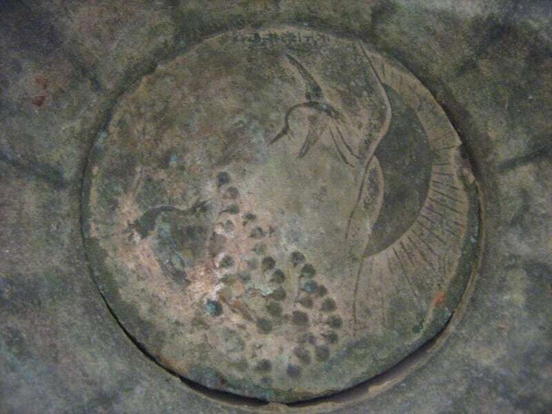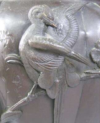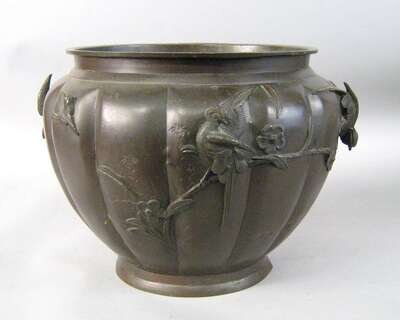 Of ribbed foliate form, applied song-birds to shoulder, old mirror base.