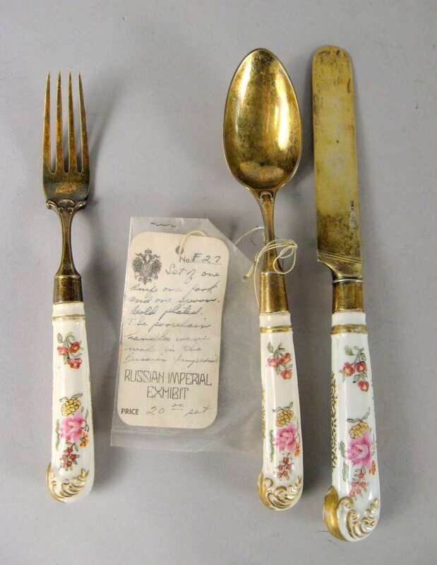 Swedish silver gilt and porcelain three piece place setting date marks for 1864/65, the porcelain possibly russian