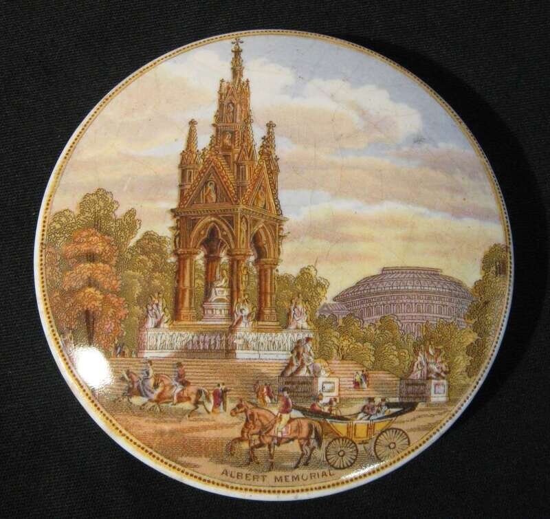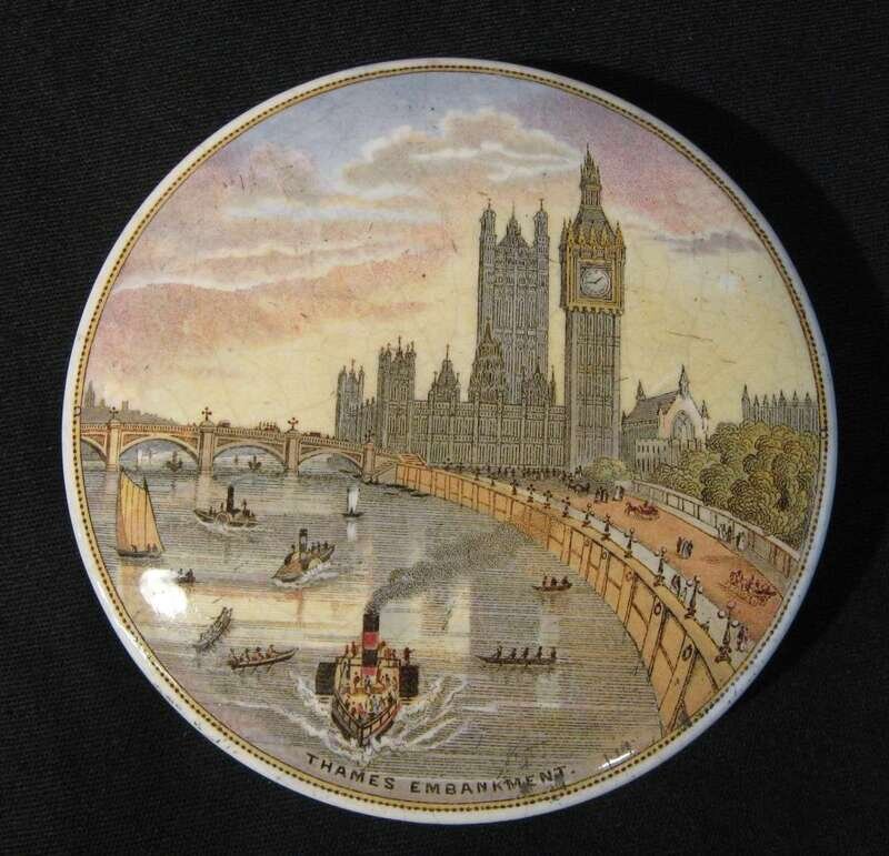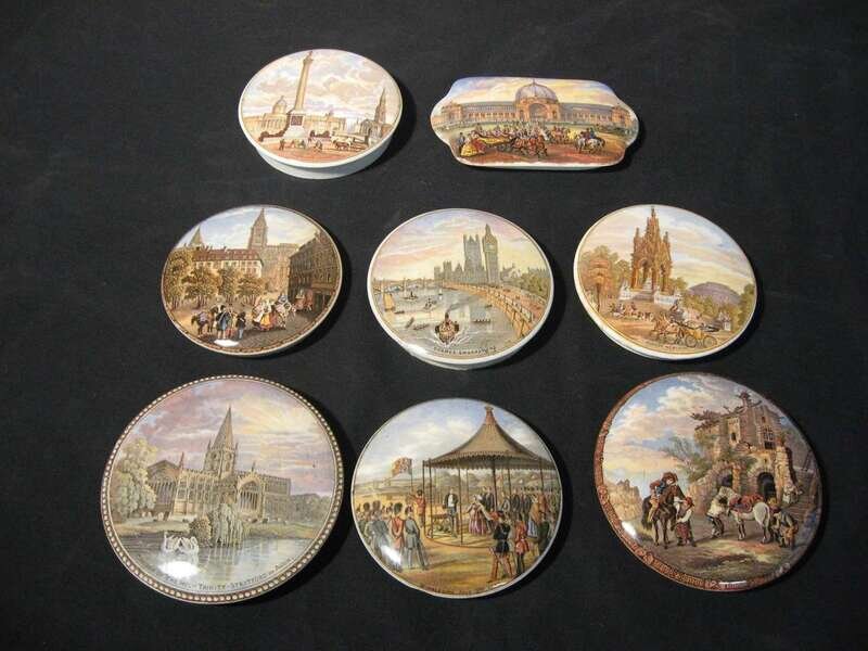 Comprising 'Trafalgar Square', 'Thames Embankment', 'The Albert Memorial', 'Wimbledon', 'The Farriers', 'Alexandra Palace' (elongated shape, 'The Church of the Holy Trinity' and 'The Square', all with transfer printed decoration.