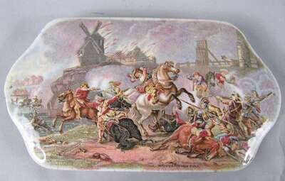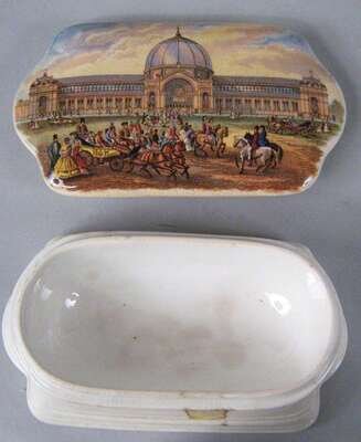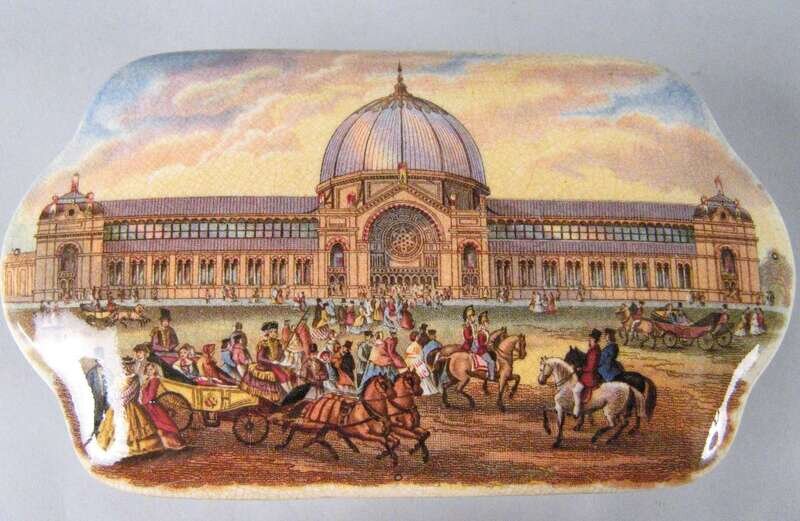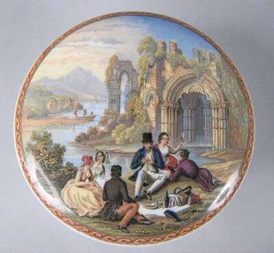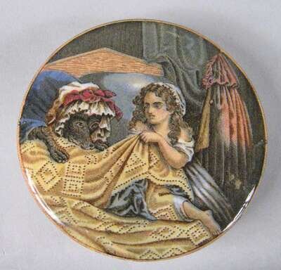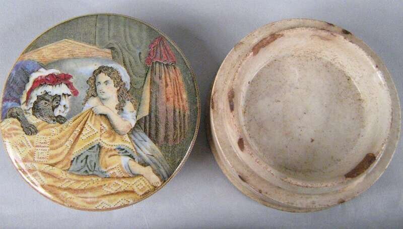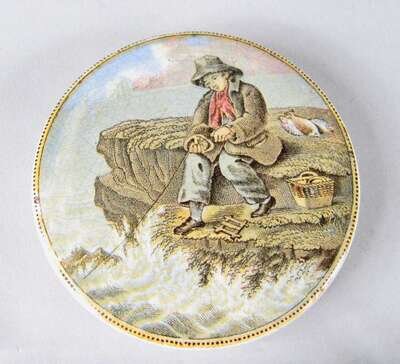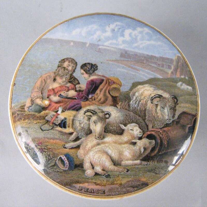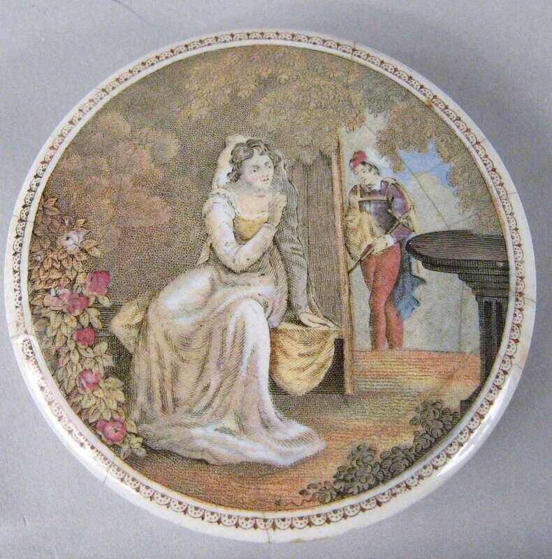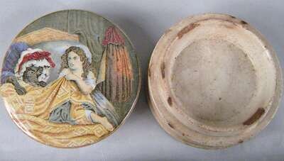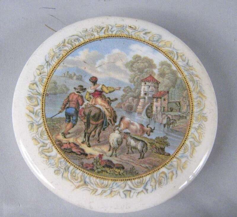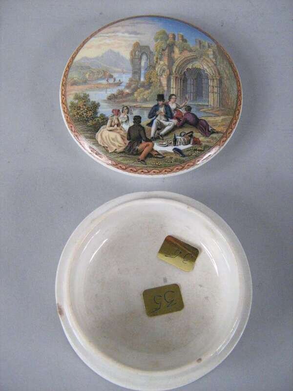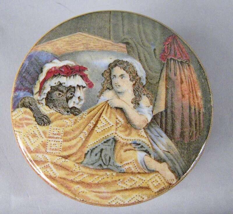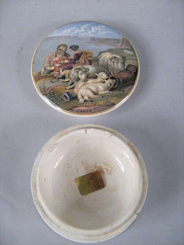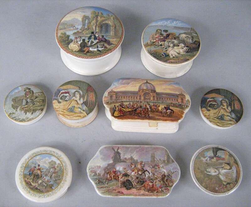 Comprising 'Peace' lid and base, 'The Alexandra Palace' lid and base, 'The Picnic' lid and base, 'Little Red Riding Hood' lid and base, 'The Fisher boy' lid, 'Little Red Riding Hood' lid, 'The Trysting Place' lid, 'The Old Watermill' lid and 'The Cavaliers' elongated lid. (9).