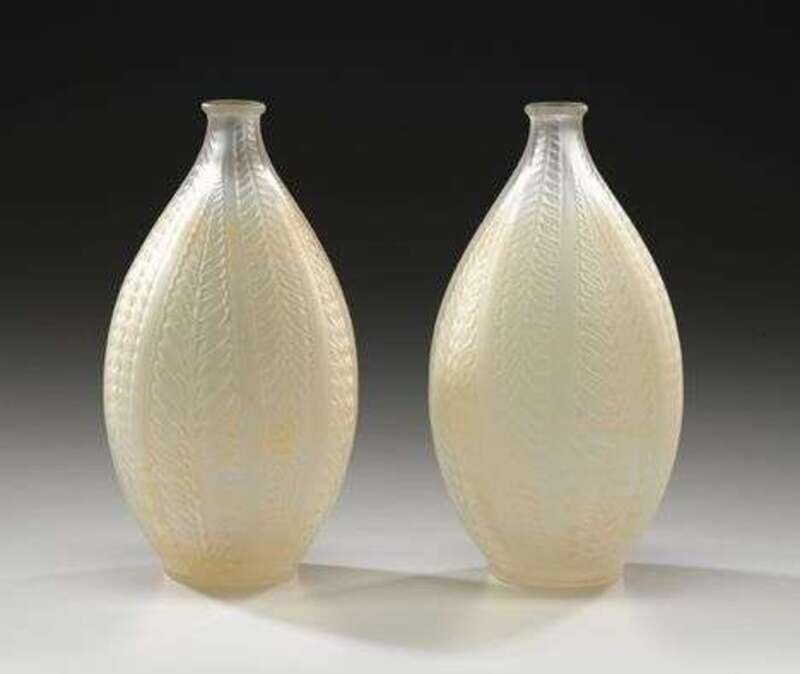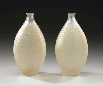 Each of baluster form with molded reeded decoration of leaves, molded 'R. Lalique' to undersides. (2).