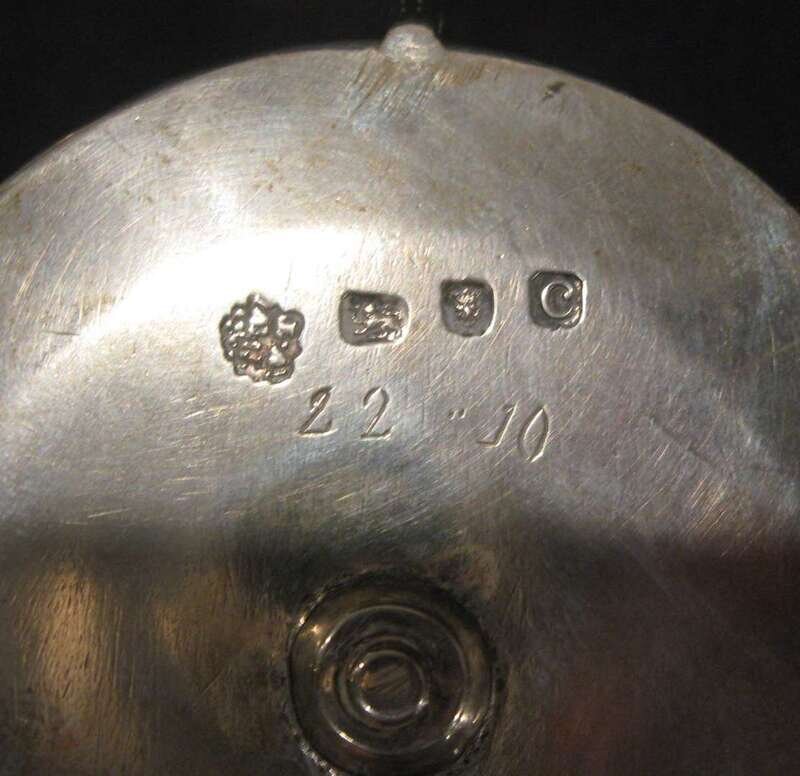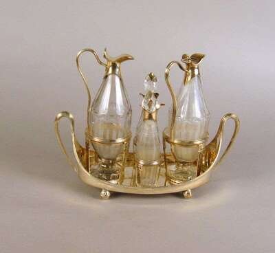 Of oval form with reeded loop handles to the sides, raised on bun feet; together with 2 associated cruets by Henry Greenaway, London, 1792 and 2 later silver plate examples.