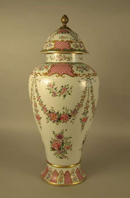 Of baluster form decorated with floral swags and pink diaper pattern reserves, the cover with a gilt metal bud finial.
