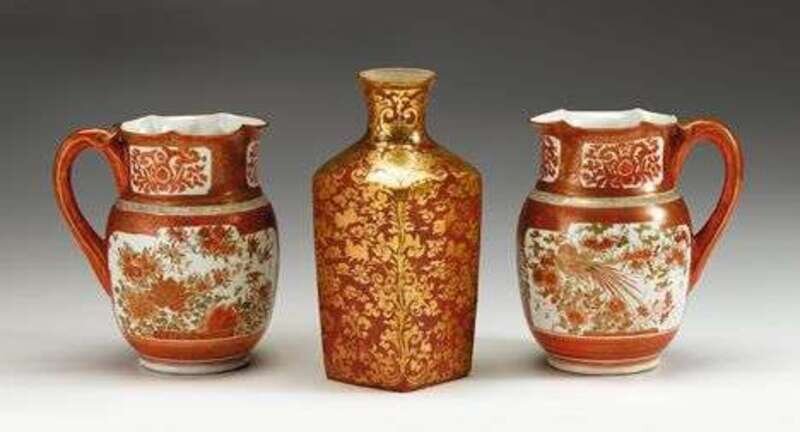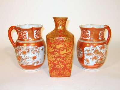 Large jugs delicately potted with foliate rims and arch handles, decorated in the Kutani palette to show longtails, together with a square baluster vase, with gilded foliate sprigs over iron-red ground.