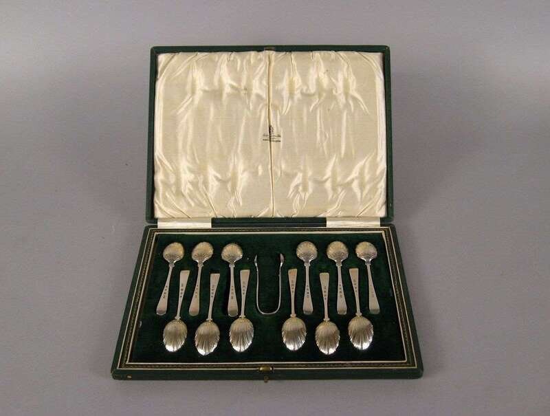 Comprising twelve teaspoons and a set of sugar tongs in a fitted leather case. (13).