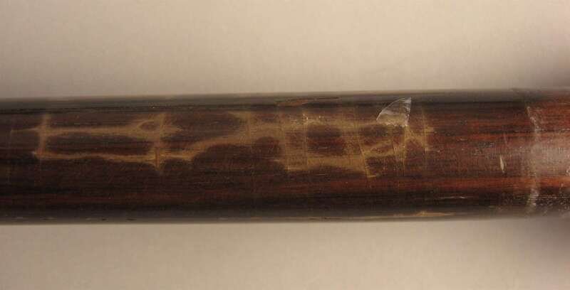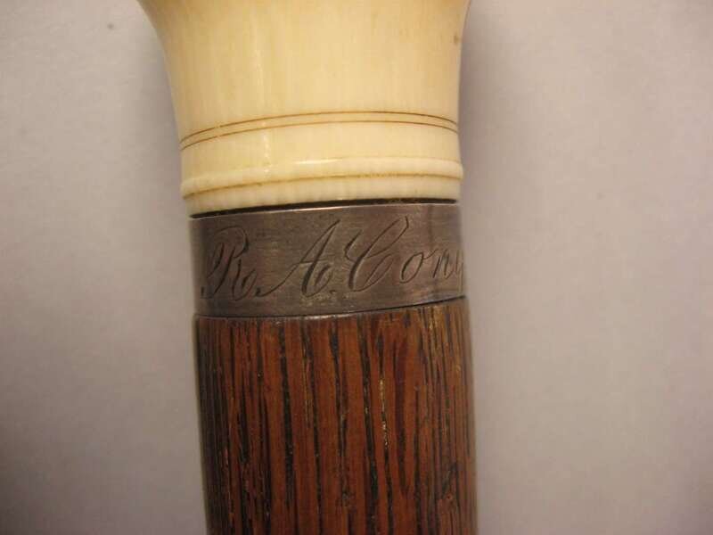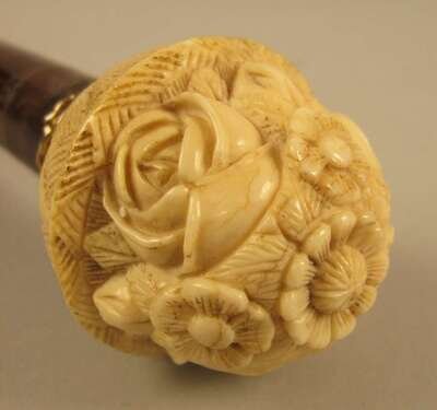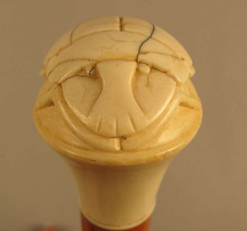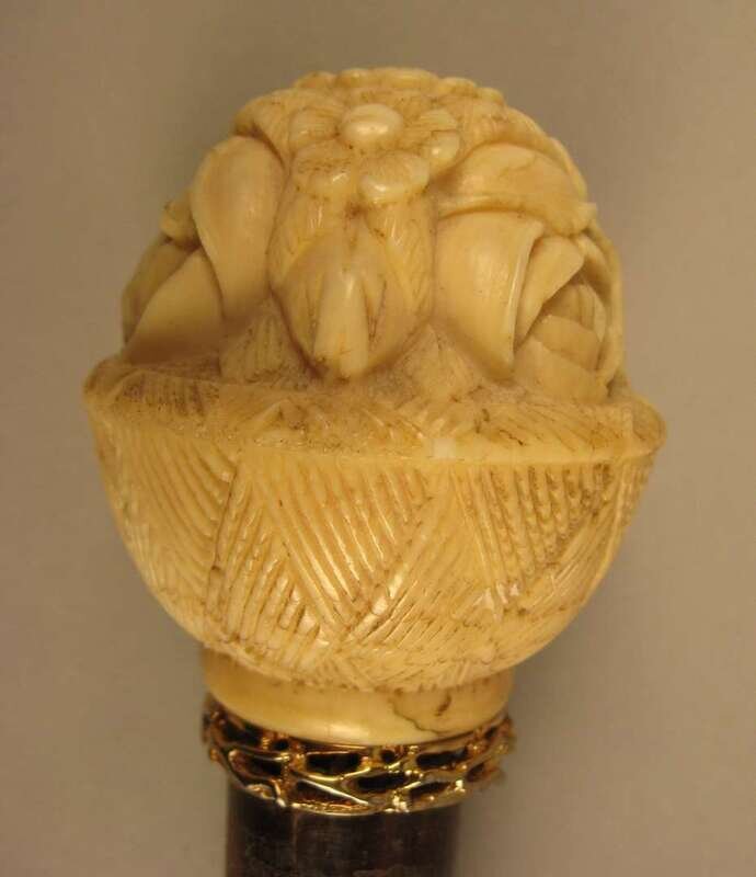 Comprising a gilt metal mounted example, the knop carved as a flower filled basket, another ivory knopped example with inscribed band 'R.A' Cory / Augusta, Maine', a stick with an ivory knop carved as a scarab and a squared exampled with an ivory cap. (4).