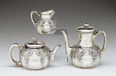 Comprising a coffeepot, teapot and creamer, each decorated with flowerheads, c-scrolls and foliage, monogrammed and dated 1890. (3).