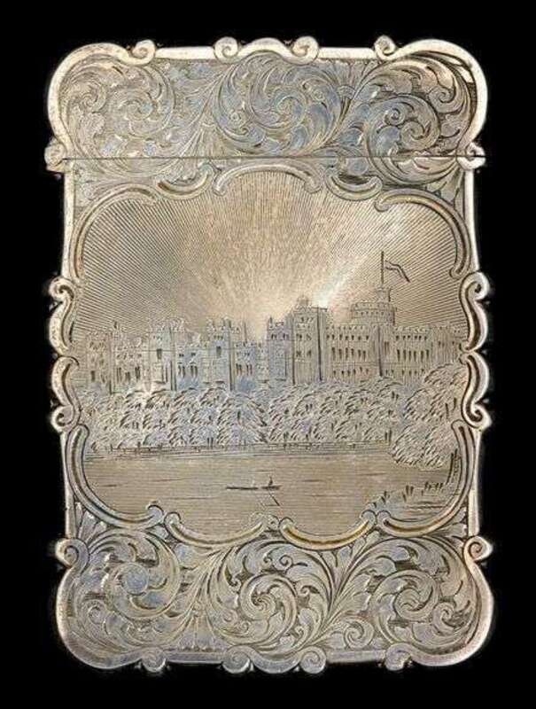 The shaped rectangular case centered by a reserve with an engraved view of Windsor Castle against a scrolled foliate ground, the reverse with a monogrammed cartouche.