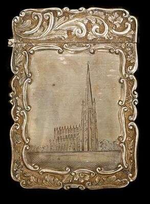The rectangular case with a scrolled edge centered with an engraved image of Trinity College, New York, the reverse with embossed foliate scrolls and a central monogrammed cartouche.
