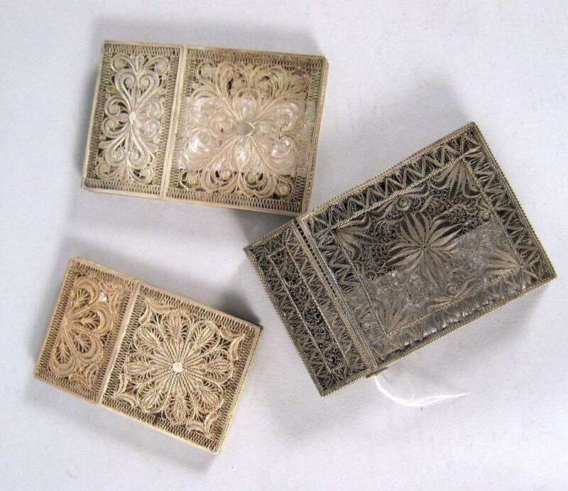 Each rectangular case with scroll and stylized floral decoration, all unmarked, the larger example with a hinged cover. (3).