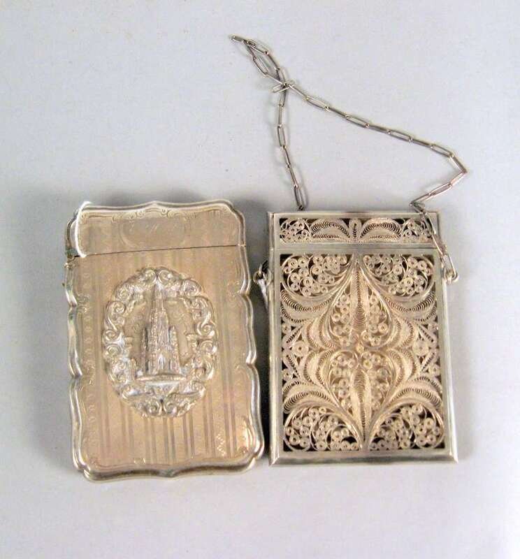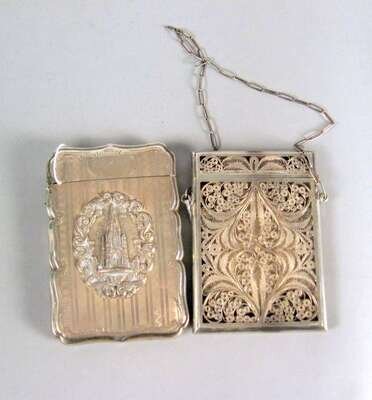 Having a scroll border, with a central relief medallion depicting the Scott Monument within a scroll and thistle cast border, monogrammed cartouche 'E.C. Wood'; together with a filigree silver card case with a hanging chain. (2).