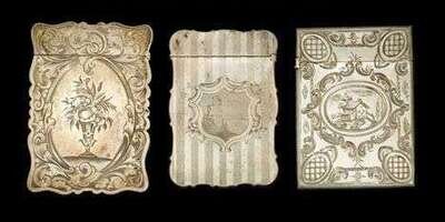 All unmarked, the first example with foliate and scroll bright cut decoration and a central reserve depicting a house in a landscape, the reverse inscribed 'Lizzie'; the second example with engraved foliate decoration with a central reserve with a flowering urn, the reverse inscribed 'S.A.K. Gilman'; the third example with engine turned striped decoration and a central cartouche depicting a lake side scene, the reverse inscribed 'G.S. Fry'. (3).