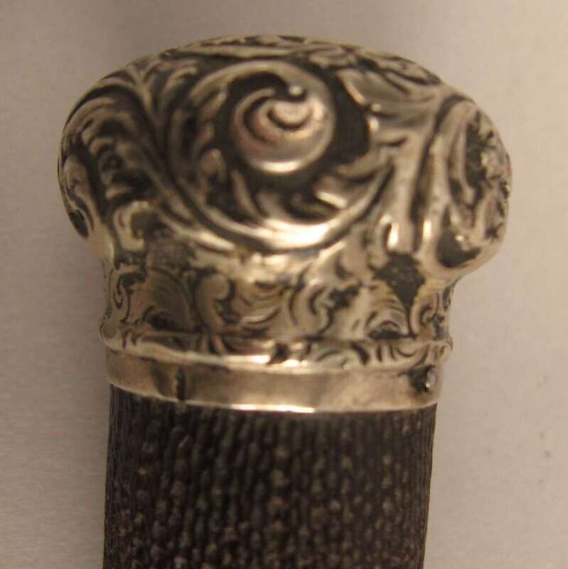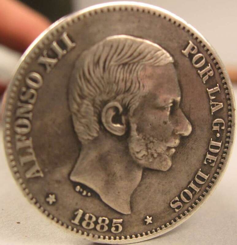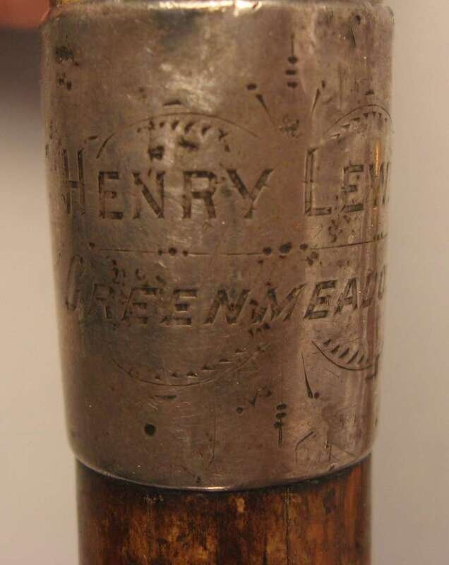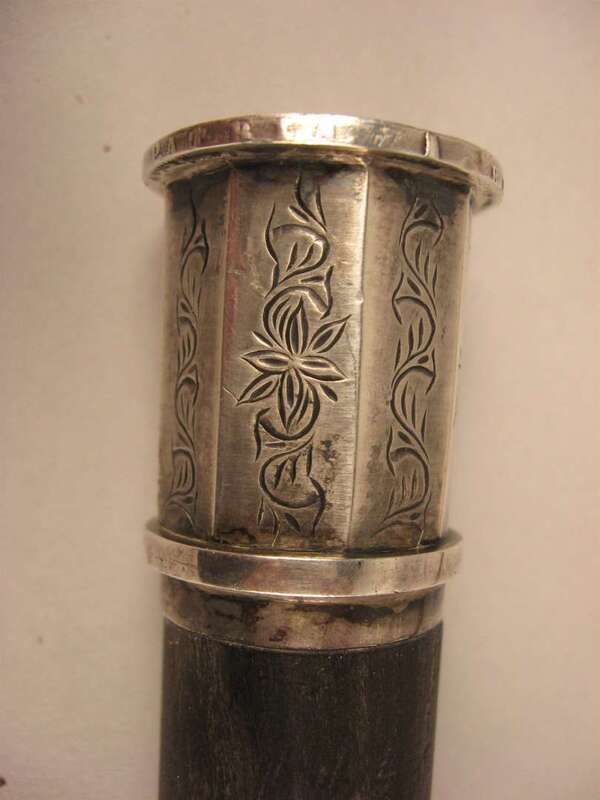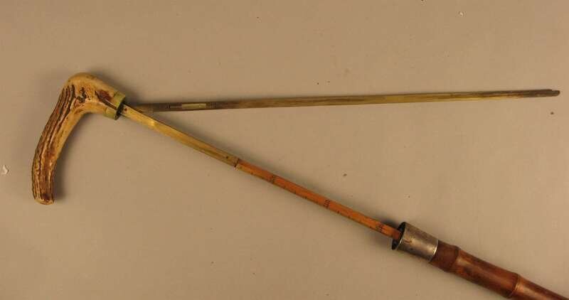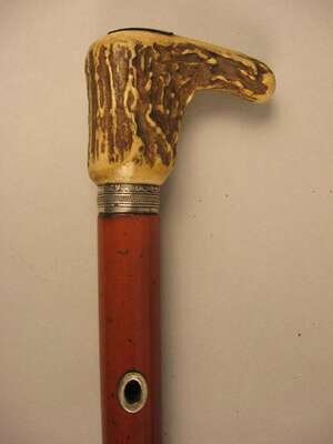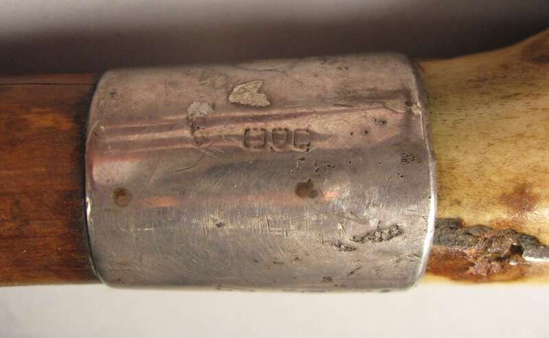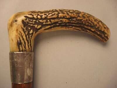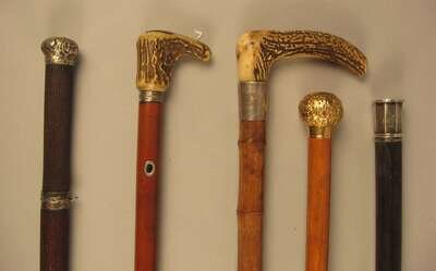 Comprising a bone handled example with an English silver collar over a bamboo shaft; a stick with the handhold mounted with a silver coin dated 1885; an unmarked silver mounted textured stick, a bone handled and silver mounted stick and a gilt washed knopped stick. (5).