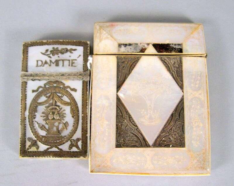 The first smaller example inscribed 'Damitie' and 'Souvenir' on the reverse, over a medallion with hearts on a pedestal; the other example with floral engraved mother-of-pearl panels around a central lozenge set with engraved silver corners, the side panel inscribed 'From Rev. H.M. Jarvis to C.S. Jarvis'. (2).