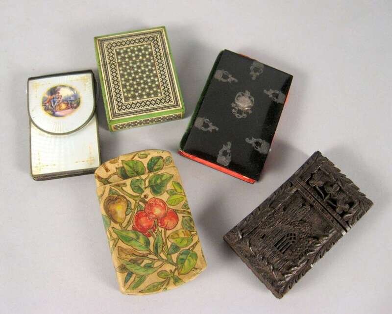 Comprising a French guilloche and enamel example; an Irish example carved with shamrocks and castle ruins; a Chinese lacquer example with applied silver mounts; a Middle Eastern marquetry example; and an Italian painted vellum example bearing a Florentine maker's label. (5).