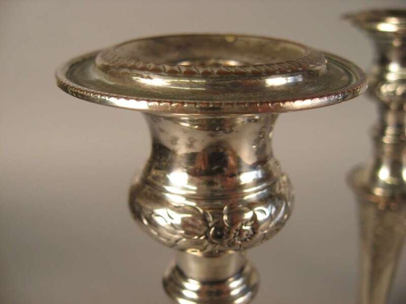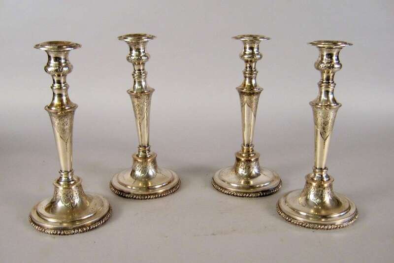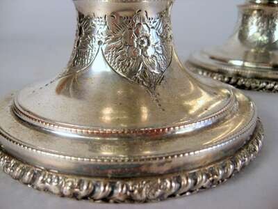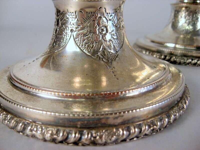 The urn-form nozzle over a tapered shaft and spreading circular foot, embossed with flower head centered panels, makers stamp to base, weighted. (4).