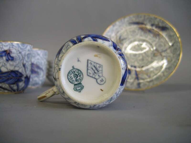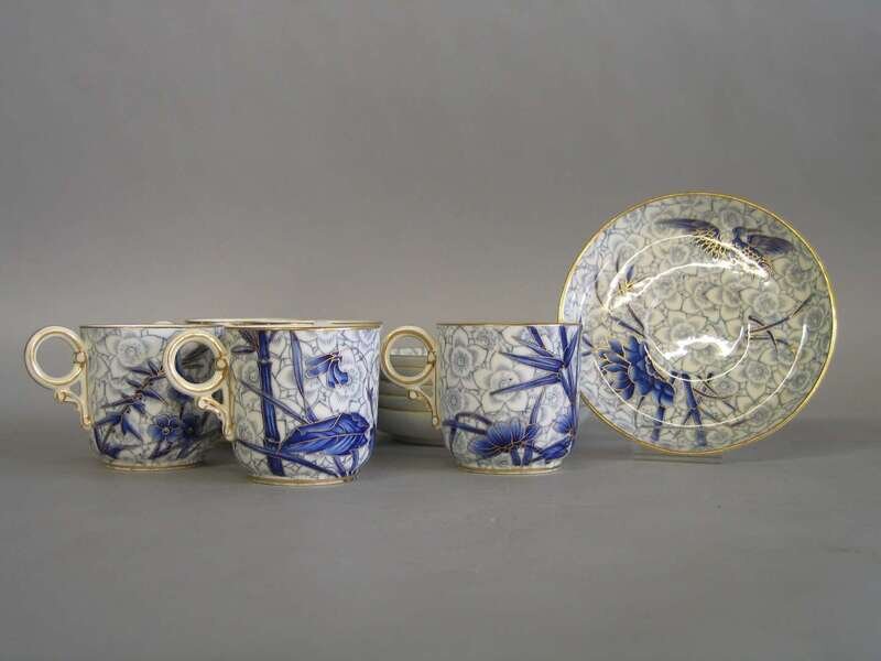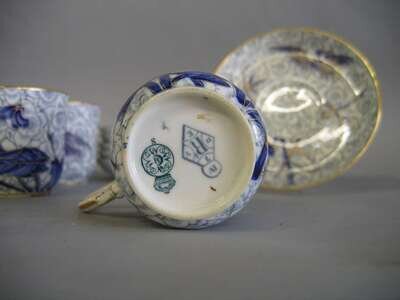 Comprising six teacups and six saucers; each decorated with birds and foliage in blue and gilt on a gray-blue floral patterned ground. (12).
