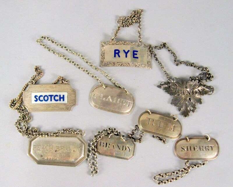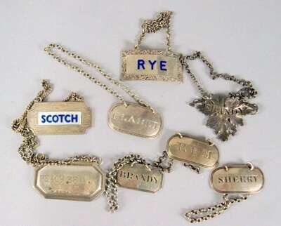 Comprising a 'Claret' label, maker's mark rubbed; a 'Sherry' label, by Charles Rawlings, London, 1826; a 'Rum' label, George Knight, 1821; two enameled labels 'Scotch' and 'Rye', Turner & Simpson, Birmingham; a 'Peach brandy' label, maker's mark rubbed; a leaf shaped 'Brandy' label, maker's mark rubbed, a 'Brandy' label by Thomas Phipps & Edward Robinson, early 19th century. (8).