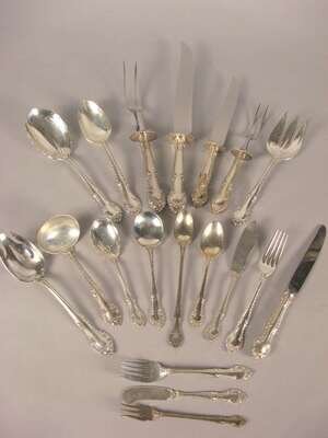 Comprising 12 dinner knives, 12 dinner forks, 12 salad forks, 16 teaspoons, 8 soup spoons, 8 cocktail forks, 4 butter knives, an iced tea spoon, 2 master butter knives, 3 olive forks, 2 jelly spoons, gravy ladle, a salad serving set, two serving spoons, a pierced serving spoon, and a four piece carving set; together with a Kirk & Sons candle 'Baltimore Rose' pattern candle snuffer and 12 miscellaneous flatware pieces. (103).