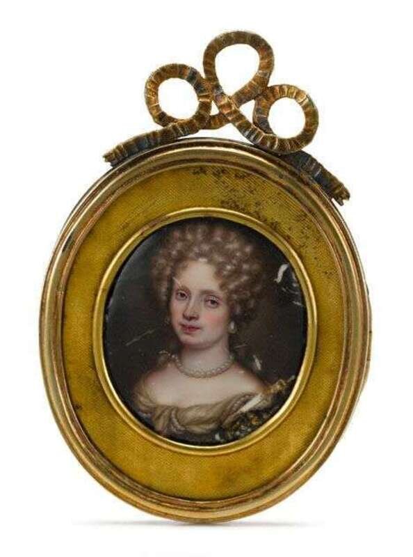 Oval, depicting a noblewoman wearing pearl earrings and necklace, in a gilt metal locket case with ribbon cresting.