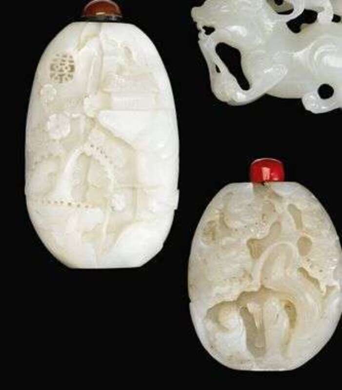 The largest of flat oval form carved to show a mountain landscape, together with a white-grey oval bottle worked to show immortals under a pine grove.