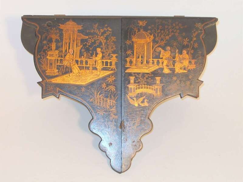 Of three hinged parts, decorated vertical and wall bracket showing gilded figural court scenes.