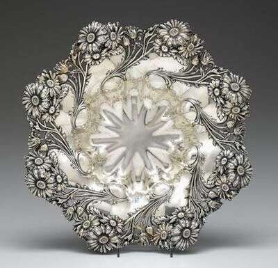 Of shaped circular form, with repousse and pierced decoration of daisies.
